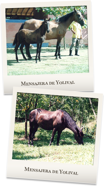 A la yegua Mensajera de Yolival le tengo mucho sentimiento, fue una yegua que me acompaño como por 7 años, se me murió de algo que nunca nadie me supo decir después de una larga enfermedad de 3 meses. La primera cría que le saque fue con el caballo Candelazo, un Potro, luego le puse al caballo Cirirí, de propiedad de Jorge Vásquez, un caballo muy fino y cumplidor su padre fue Candelazo y madre la gran yegua Casquivana de Carnaval, la mamá del Caballo Romancero fuera de concurso. De allí me nacieron Mellizos, el potro se murió en el parto y la potranca nacío sin caminar, pero le ayudamos por tres meses a sostenerla hasta que quedo para Mí, Mí mejor yegua de silla que he tenido en mi vida, La Cariñosa del Suroeste, la madre de Paz del Suroeste y todas mis yeguas de cría. Luego le puse a Capiro XIII hermano de Amadeus y luego le puse a Jazmín el abuelo de Virrey de las Guacas. De estos últimos nacieron dos potros. Luego le puse dos veces a Amadeus, me dio una yegua que hoy esta de reproducción y un potro muy bueno llamado Tormento, en aquel entonces compitió con Carbón el de San Pascual y le gano.