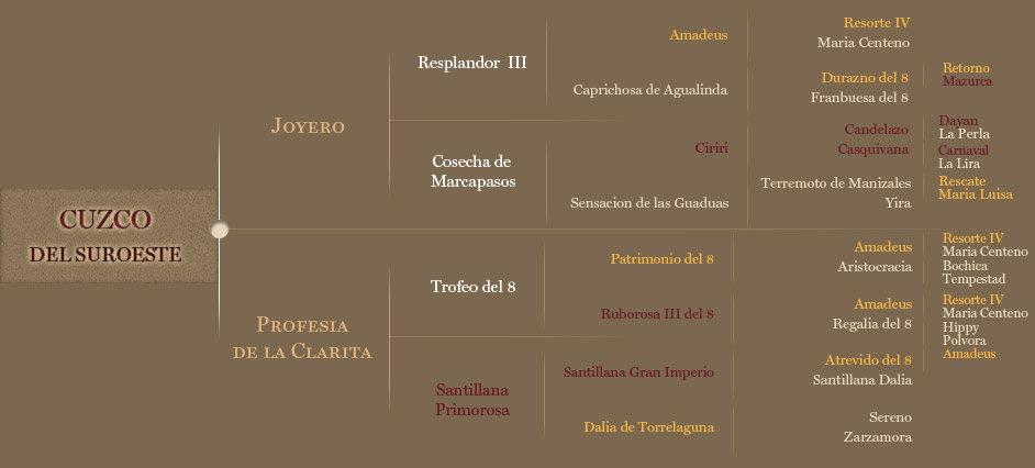 Cuzco del Suroeste, es un potro nacido en Diciembre de 2010, Hijo de Joyero en Profecia de la Clarita. Tiene el cruce de la linea de Patrimonio del 8, Atrevido del 8 con Joyero.